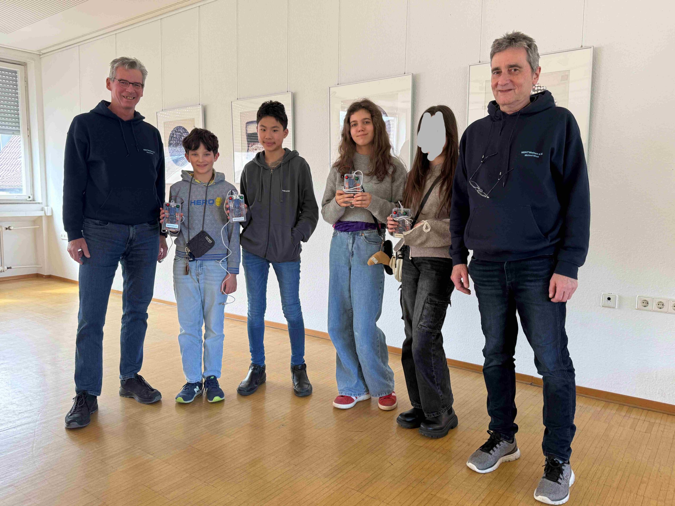 Arduino Aufbaukurs mit Eduardo, Kadir, Gabriele, Julian, Yannik und Amelie (v.l.n.r.), es fehlt im Bild Matteo. Links im Bild die Trainer Klaus Rudelt und Michael Wisst.